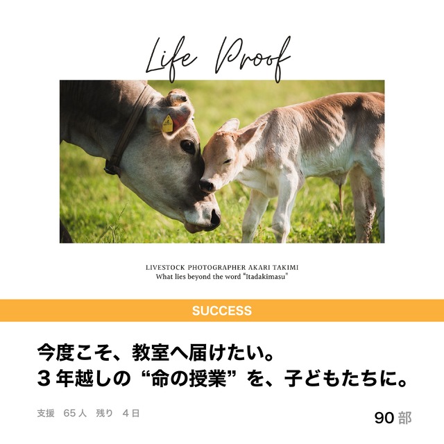 皆様のおかげで、目標達成できました。ありがとうございます。 【商品説明】 このフォトブックは、北海道・名寄市の小学校で予定している特別授業を実現するための支援リターンです。売上の一部を、授業の実施に向けた活動費に当てさせていただきます。 ▼プロジェクト詳細 https://note.com/akapple/n/nbf8835d509be タキミアカリとしては久しぶりの新作となるフォトブック。 バージョンアップした作品集を是非ご覧ください。 このフォトブックは、授業の教材としても使用いたします。 ・A5横サイズ(46p) ・タキミアカリがこれまで撮影してきた家畜(牛、豚、鶏)の写真を収録 ・ポストカード1枚(動物種はランダム) ※目標が達成してからの発注となるため、支援者様への発送は8月上旬〜中旬を予定しています。 ※リターン商品につき、今のところは90部限定販売となります。 ※システムの都合上、銀行振込の使用を中止しています。ご希望の方は、お手数ですが直接メッセージをお願い致します。 【授業について】 テーマは、 「“いただきます”の先にあるいのちに目を向けること」。 写真をきっかけに、子どもたちと共に、命の背景や食のつながりについて考える時間をつくります。 授業は約10コマ程度にわたって実施される予定です。 ▼前回の授業の一部(2021年実施) https://youtu.be/CXHwNmuq2ls?si=c6o6uIfYThfld_1c https://www.youtube.com/watch?v=xEjZZIr8Bd8 【実施の条件と目標】 このフォトブックの販売数に応じて、授業の形式が決まります。 ◎90部 達成 ・対面授業(2コマ)+オンライン授業(8コマ) ・フォトブック寄贈(生徒13名分) ◯60部 達成 ・オンライン授業(10コマ) ・フォトブック寄贈(生徒13名分) ⚠️ 販売数が目標に達しなかった場合、授業は実施されず、フォトブックの制作・発送も行いません。 ご購入者にはBASE経由で全額返金となります。 【最後に】 このフォトブックの売上は、特別授業の実施に向けた活動費として大切に使わせていただきます。 達成した際には、活動報告として、授業終了後に生徒たちの感想文をメールにてお送りさせていただきます。 みなさまのご協力、どうぞよろしくお願いいたします。